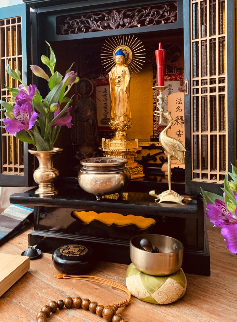 A liturgia budista é vasta, por isso este é um post breve sobre butsudan. Cada escola tem sua estética. De maneira geral, todas elas contém os elementos do Ícone Sagrado, as flores, o incenso e a vela. Você pode criar um oratório de acordo com o que estiver ao seu alcancem, de forma graciosa, elegante. Lembre-se, é o Buda em sua residência e como um nobre hóspede, queremos proporcionar o melhor lugar, o vaso mais bonito. Mas antes de tudo, é importante entender o significado de upaya (ou hoben em jap.), os hábeis meios salvíficos, como a função de um espelho e de uma inspiração e aspiração à Terra Pura. Não é algo a ser idolatrado, e tampouco ali está assentada uma entidade ou espírito no oratório, como vemos em outras tradições religiosas. A significado no Shin é sobre o chamado do nosso despertar ao Voto Original ao executar o exercício da prática e da fé budista. Por isso, a liturgia é a expressão da gratidão e do louvor ao Buda por ter garantido o Ir-nascer na Terra Pura rumo ao Supremo Nirvana a todos os seres viventes.