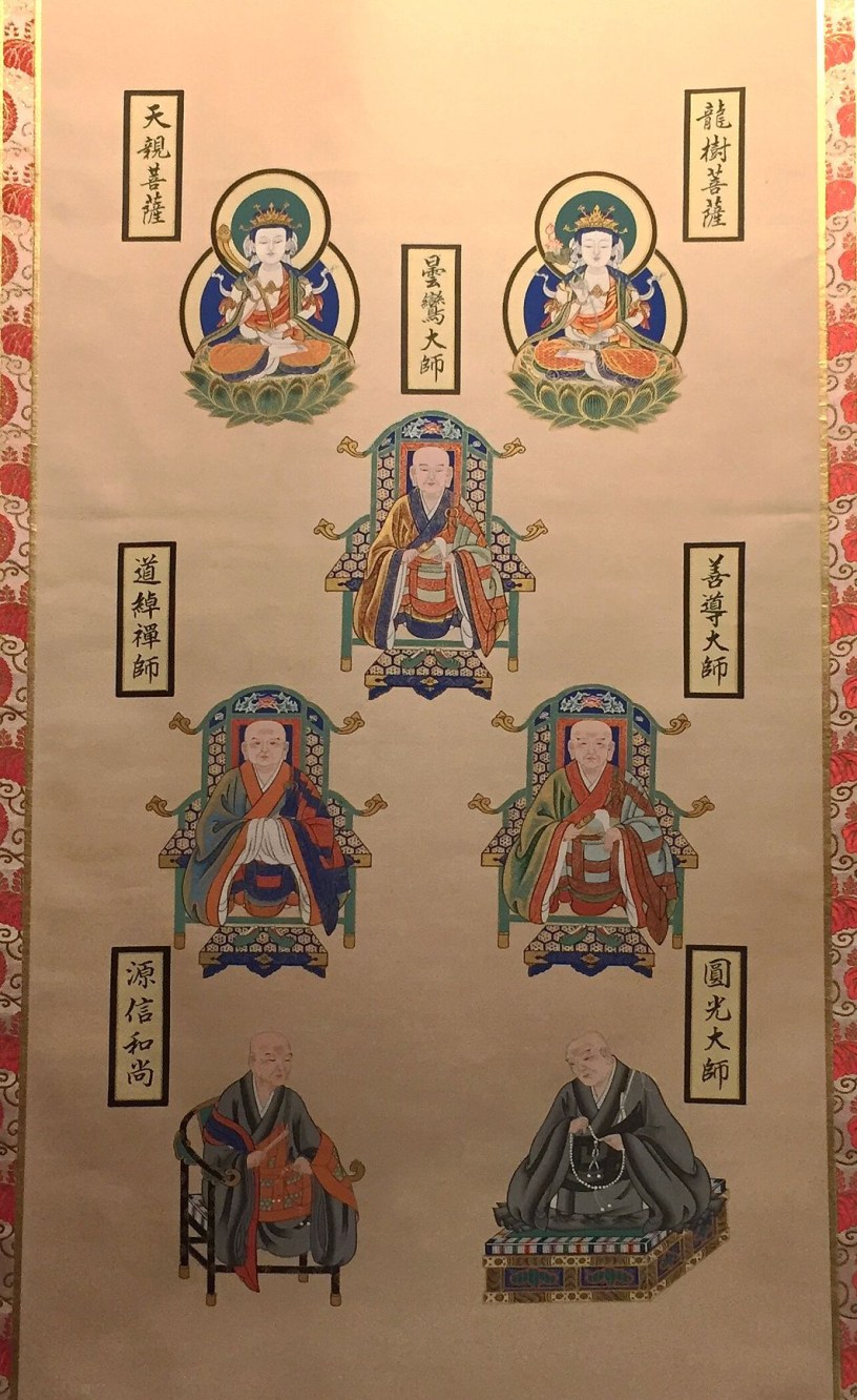 A genealogia dos Ensinamentos da Terra Pura do Mestre Shinran (1173-1263), o fundador do Budismo Shin, tradição Terra Pura, é considerado por muitos teólogos e historiadores como um dos mais importantes pensadores do Japão. Ele não fundou nenhum templo, mas empreendeu uma extraordinária sistematização do Budismo da Terra Pura, ao compendiar cuidadosamente mestres budistas da Índia, China e do próprio Japão. De fato, há muitos monges ilustres da China e do Japão que instituíram práticas e registraram ensinamentos sobre o Buda Amida e a Terra Pura. Dentre eles, Shinran selecionou cinco mestres que, ao lado de dois grandes mestres indianos, representam a genealogia do verdadeiro ensinamento, assim compreendido por ele. Não há uma lista específica ou emprego do termo “sete mestres” em sua obra, mas na releitura-síntese que Shinran fez de toda a tradição da Terra Pura, a vida e a obra desses mestres tiveram um papel fundamental. Como ele assinala no Kyogyoshinsho: