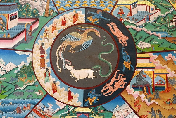 Da ignorância como condição, as formações volitivas [surgem]. Das formações volitivas como condição, a consciência. Da consciência como condição, a mentalidade-materialidade (nome e forma). Da mentalidade-materialidade (nome e forma) como condição, as seis bases dos sentidos. Das seis bases dos sentidos como condição, o contato. Do contato como condição, a sensação. Da sensação como condição, o desejo. Do desejo como condição, o apego. Do apego como condição, o ser/existir. Do ser/existir como condição, o nascimento. Do nascimento como condição, então o envelhecimento e morte, tristeza, lamentação, dor, angústia e desespero surgem.