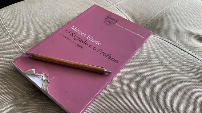 Ah, o bom e velho Mircea Eliad para explicar a questão do sagrado e o profano neste grande mistério que origina as religiões pelo mundo (e sim, minha cachorra resolveu brincar com o livro!).